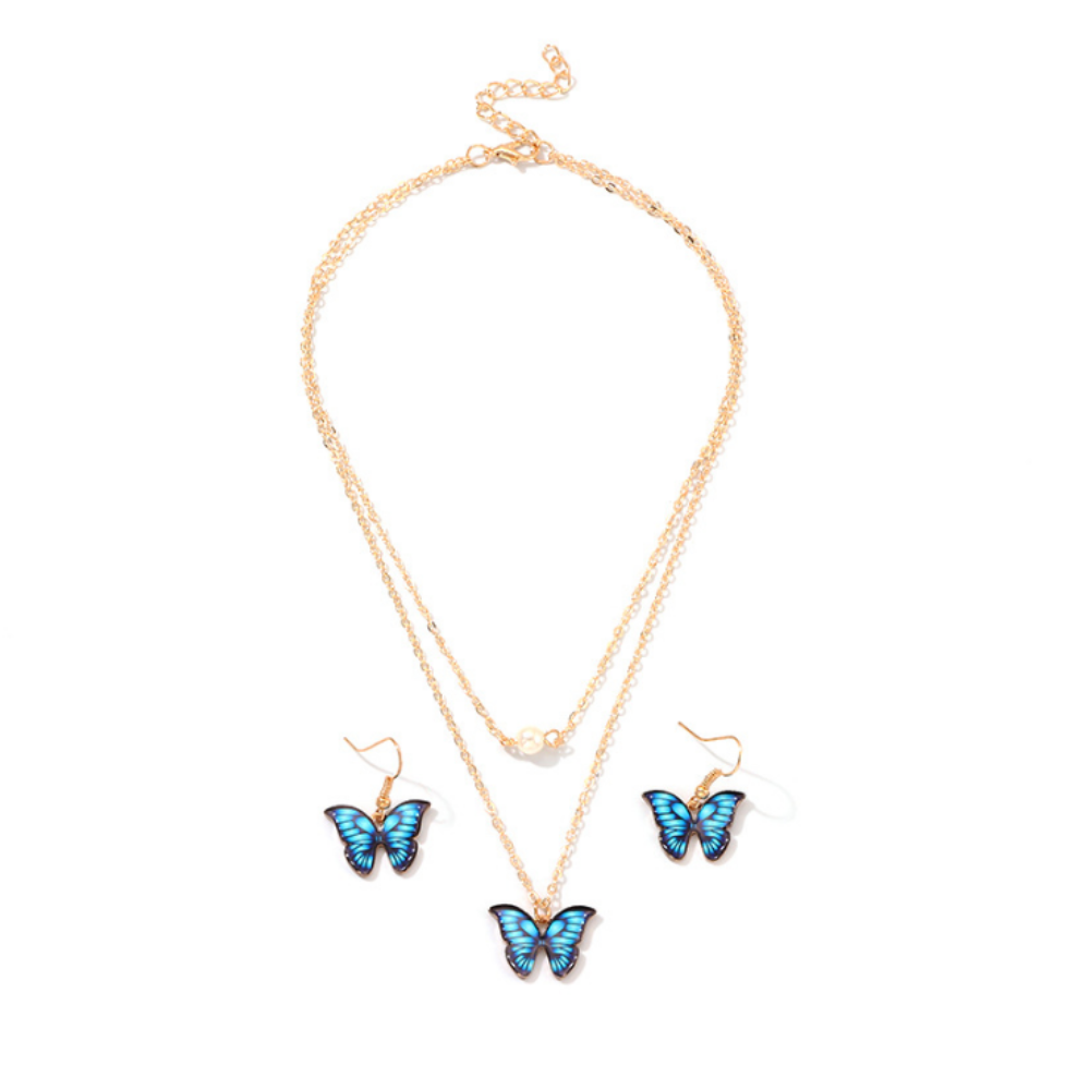 Halskette- und Ohrringe-Schmetterlings-Schmuck-Set blau, Damenschmuck